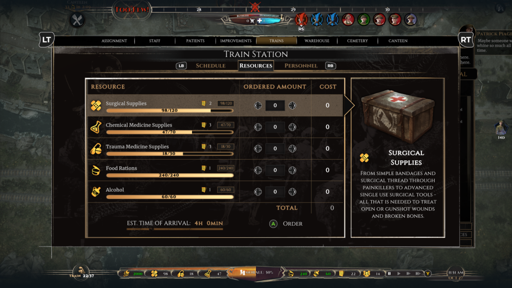 When it comes to resources you have 2 options. Hire engineers to make supplies for you, or order some from HQ that arrive via train in intervals. Both have their positives and negatives. Ordering from HQ requires other resources (I’ll call it money for simplicity sake). But those same resources are also required to upgrade your hospital and produce medicine and food. Spend too much of it buying your supplies and your hospital wont be upgraded enough to keep up. Dont spend enough and you will likely not be able to keep up. Again its a balance that they do well here.