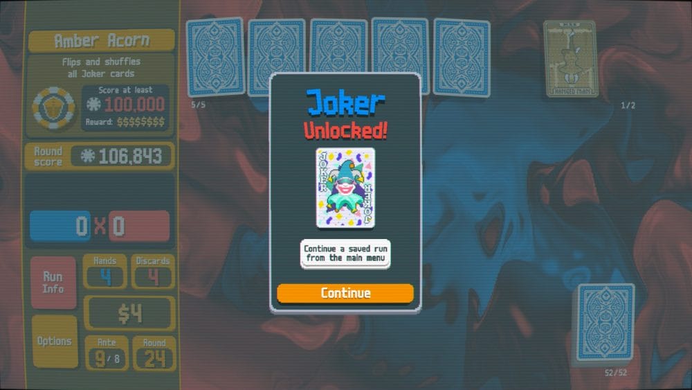 It isn’t though. You’re never going to progress up the antes by just playing standard hands of normal cards. You need an Ace up your sleeve. Or in this case, a selection of jokers. You can hold up to 5 jokers at any given time and they modify your scoring in a multitude of weird and wonderful ways. Similar to other deck builders, you unlock more cards as you progress through your runs, but also by meeting certain requirements. On my 2nd run I unlocked a new joker by winning 5 consecutive matches by only playing one hand.