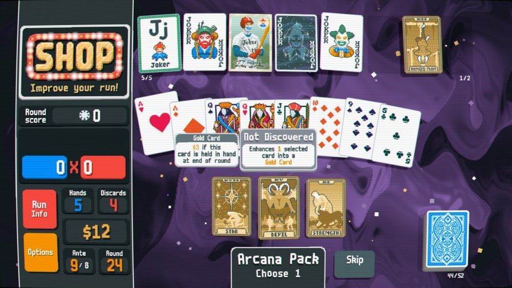 If you’ve ever played poker before you’ll be familiar with the standard scoring system in Balatro. You start with a normal 52 card deck, 4 hands to play and 3 chances to discard up to 5 cards of your 8 card hand (the starting red deck comes with one extra discard per match, but other decks with different modifiers are unlocked as you play). Each hand (pair, two pair, etc) has a standard score that is modified by what cards you play (Aces – 11, Face cards – 10 and so on). You either play or discard cards until you run out of hands or gain enough chips to move onto the next opponent. Seems simple enough.