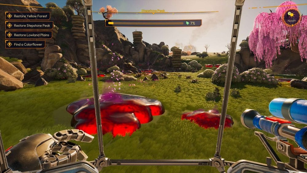 After you have harvested your crops and got your presses crafting its time to explore. The environment is stunning, filled with vibrant colours and gorgeous wildlife. The map is split up into 9 different zones. The starting area is a vast open space filled with stone, softwood and Polyberries. Most of the different areas are available to explore right away, however they are covered in a toxic sludge which you must clean up. Once done the area transforms revealing new plants and materials to collect and help advance your crops and farm. There are also mysterious ruins to explore each one revealing a secret.
