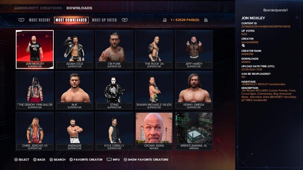 One of my favorite things to do and what I spend a lot of time in early on is in the creation studio. I love the creation studio, you get to design your wrestler(s) from their entrance, move set, their look and more. You can upload you own logos, fan signs, face textures and so much more to make your wrestler look how you want. Also please let me give a big shoutout to the CAW (create a wrestler) community for 2K24. Before the game even hit full release you had thousands of wrestlers, images, belts, arenas and so much more ready to download. You can find wrestlers from other organizations, retired wrestlers and even superheroes. The CAW community for 2K24 alone is such a great asset to have.
