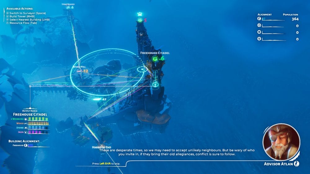 The world of the Ursee is vast and beautiful, with pockets of resources, refugees and survivors of the War of the Tree. In the 1st campaign mission, that also serves as a tutorial, you're gradually introduced to the city building aspect of the game and the four factions (Freehouses, Mancers, Imperium and Bannerless). Starting with a Freehouse outpost, you need to find access to Wood, Stone and Iron to expand and upgrade your settlements. This is where the unique mechanics first start to show. Resources are moved around your city using pathways connected by towers and the number of each resource being generated indicates how many pathways it can travel before being "˜depleted'.