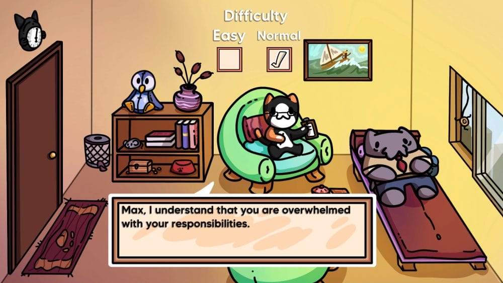 The style is very much what you might expect from a cosy game. It has a very cartoony art style and what I assume is supposed to be relaxing music. There is only one song though, with maybe 2 bars at most and I had to turn the volume off as it got pretty grating. The subject matter however was a little less cosy. As the titular Doctor Cat, you give advice to each patient on their very serious life issues. One cat had depression, another suffered from binge eating disorder and another had a gambling addiction. I think this could maybe fit into the cosy game genre if the responses to each problem wasn’t exactly the same. I (Doctor Cat), can help you overcome this problem. And then you ask them to leave, presumably.