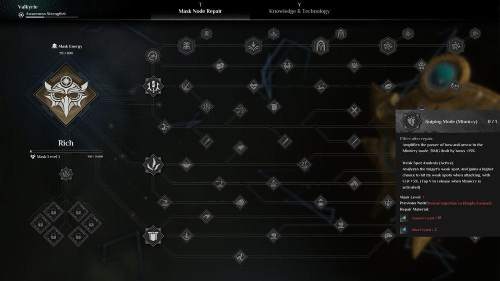 What makes it stand out aside from its solid combat and crafting system, is its class system. A gigantic skill tree is based off of the mask you choose in character creation. These are the three types of masks and the perks they focus on …..