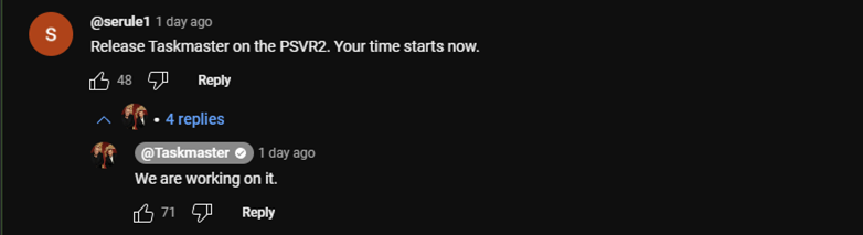 Now, as a HUGE Taskmaster, I’m gutted that this is only currently going to be available on Meta Quest, but there’s hope for fellow PSVR2 players, like myself. The official Taskmaster YouTube page responded to a rather brilliant comment asking them to bring the game to Sony’s platform. See the comments and response below: