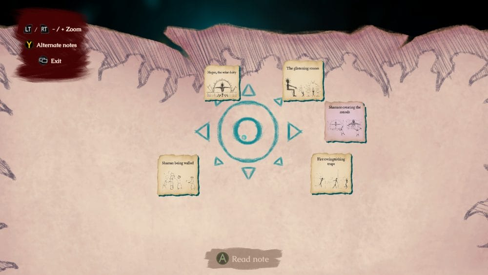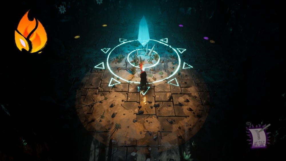 Armed with just your torch you explore a temple to find these secrets. You use the light from your torch and glowing crystals to open up paths to reach murals. You also have a notebook in which you use to sketch the murals in an use as a reference to help guide you. Your torch is very vital to your survival in this game, if your fire goes out you will dive into madness.