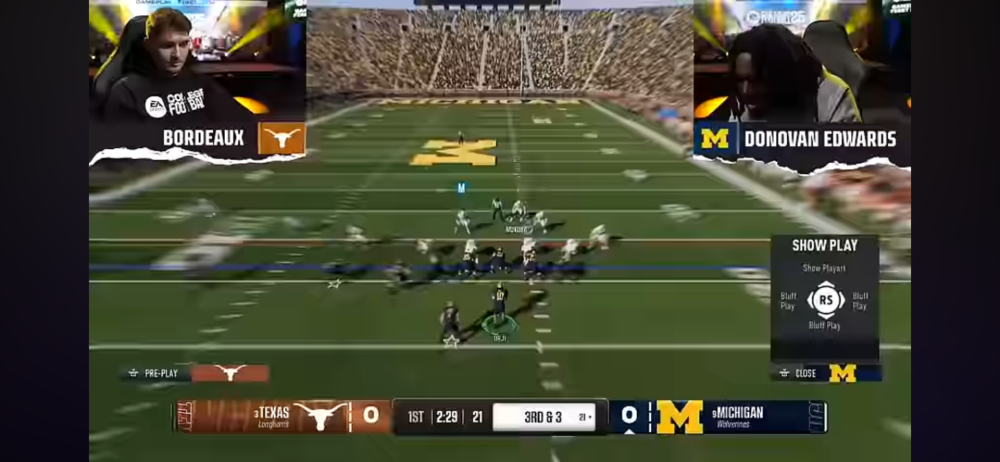 So today EA Sports gave us a first look at game play for CFB 25. This game has so much hype around it and the developers have shown it’s not just a reskinned madden. Today’s gameplay first look we see YouTube content creator Bordeaux play against cover athlete, star running for the Michigan Wolverines, Donovan Edwards. The first look was hosted by Nick Mizesko, Scott O’Gallager, CFB 25 Design Director and Will Sykes, CFB 25 gameplay designer.