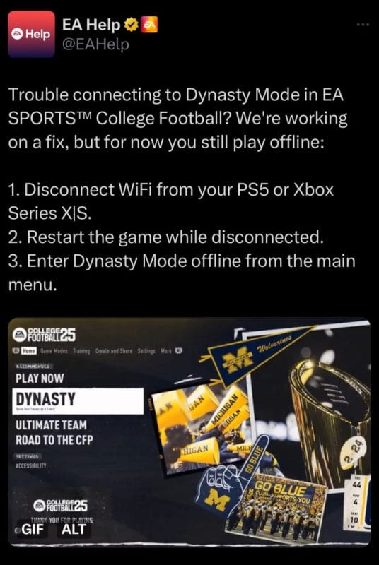 So some people are experiencing issues trying to connect to dynasty mode in the CFB 25. Per EAhelp on X, for those having this issue, it's best to play or start your dynasty offline. They are working towards resolving this issue as well but for now the break down is; disconnect the WiFi from your console, restart your console and then enter dynasty mode offline from the main menu. Go here for the full breakdown and instruction video.