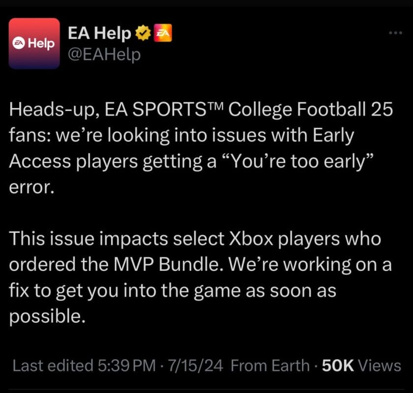 Another current issue that seems to only be happening for my fellow Xbox users, we are getting a "You're Too Early" error message when trying to start the game. For those players that preordered or bought the MVP bundle on Xbox we are experiencing this issue. While it's not affecting everyone there are still plenty of people experiencing it. Once again per @EAhelp on X, this issue is being worked on. Click here to follow up on this current situation.