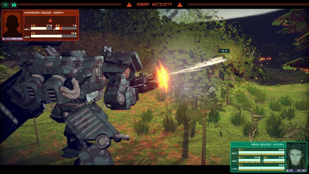 Combat involves positioning your mechs, using terrain to your advantage, and executing coordinated attacks. I particularly enjoyed the movement of the mechs, they dash across the terrain in a really fun manner, and the different abilities of the squad made me really think about my positioning and AP. The cover mechanic and fog of war also worked well; although it sometimes felt unclear as to why one of my team was no longer in cover. There’s also the classic tactics “issue” of missing your opponents – and while the evade chance is clearly stated when you set up an attack, it seemed a little arbitrary especially on the final mission.