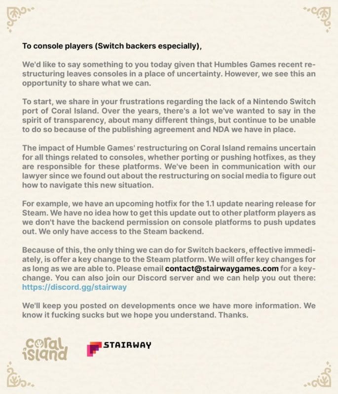 A few days ago it was announced that Humble Games was letting go of most (all?) of it’s staff and “restructuring” the publishing arm of the company. Many fans were upset by this and now we can add a developer to the list of upset people as Coral Island developer Stairway Games has voiced their frustrations and displeasure with the ongoing situation.