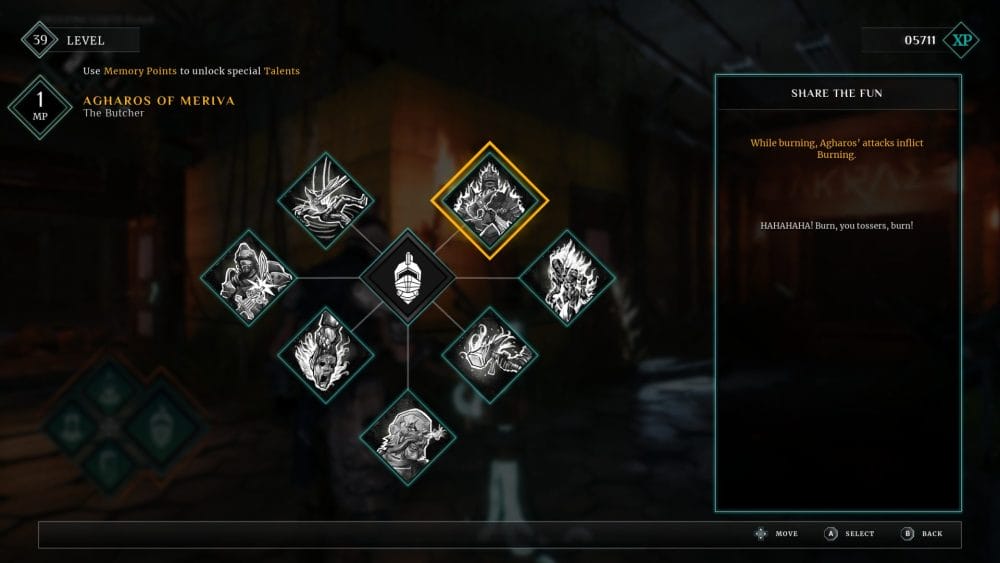 You can upgrade your party members when you collect the aforementioned memories in the game. These unlock ‘Memory points’ which allow your buff your characters in certain ways (add corruption or bleeding to weapon, increase damage for a certain amount of time after performing a perfect block etc.).