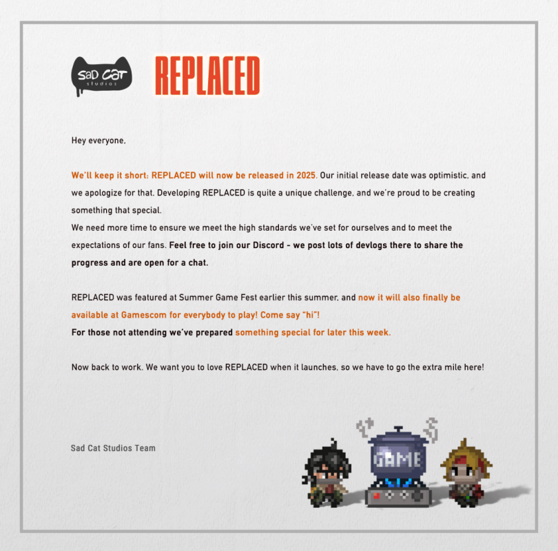 Replaced, which is currently an Xbox console exclusive (day 1 on Xbox Game Pass) that's also releasing on Steam, Epic and GOG has seen a multitude of delays because of the ongoing war in Ukraine. Taking to X on the official Replaced account they posted the following image.