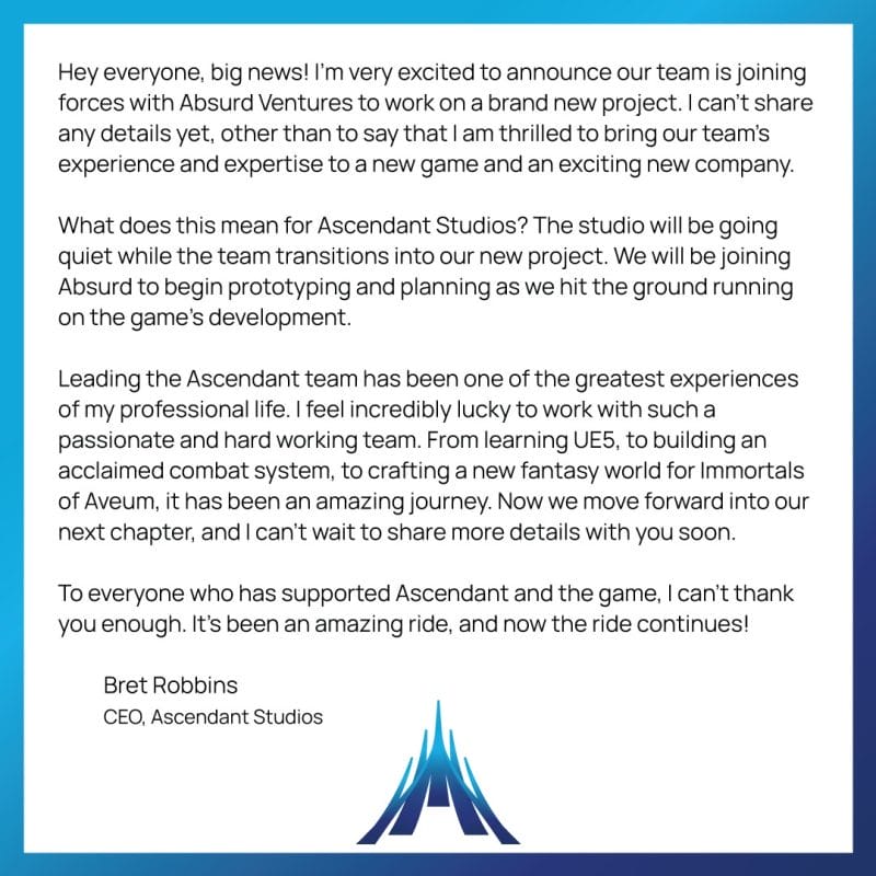 The new studio will be based in California and involves 20 staff members from Ascendant Studios including CEO Bret Robbins. It is not entirely clear if Ascendant still exists in any capacity or not, but for now the team is working to transition over to Absurd Marin.