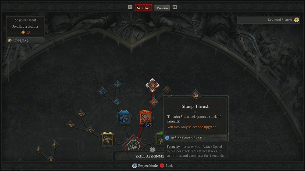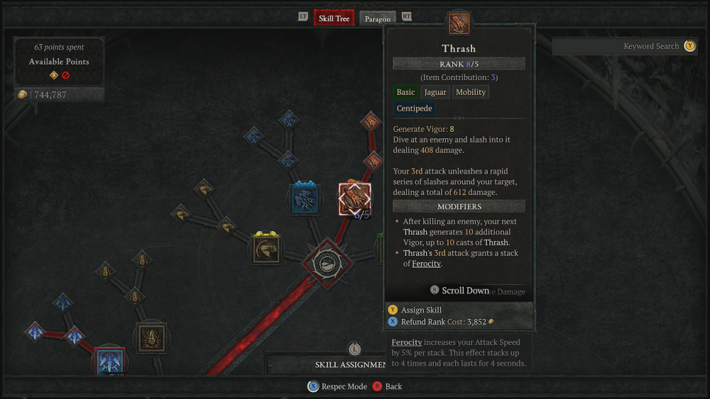 I went with Thrash, it's a jaguar ability by default but because of our Centipede Spirit Hall it is also a Centipede attack. This is our main source of Vigor replenishment. Thrash launches you forward at an enemy slashing dealing damage. Your 3rd attack is followed by a flurry of slashes. You will also be getting stacks of Ferocity which increase attack speed with each stack. Sharp Slash grants a stack of ferocity on your 3rd slash.