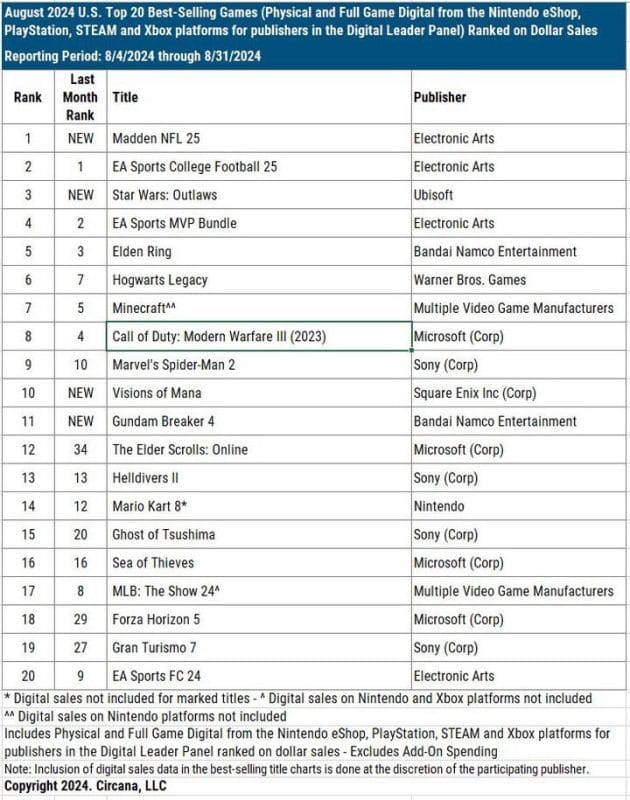 Circana has released its August video game sales report today. The company is a bit behind on the data but it is here now and to the surprise of no one, Madden 25 has topped the monthly charts ahead of Star Wars Outlaws.