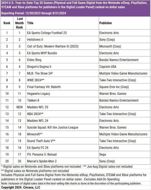 Infact, Football is so popular in the US that the sport occupied 3 of the top 4 spots in the August report with EA Sports College Football coming in 2nd as well as it's MVP bundle coming in 4th despite the game releasing in July. For the entire year College Football remains the best selling game, with the MVP edition now being the 4th best selling game on the year. The MVP edition is a premium edition for those unaware. Madden 25 sits in 12th place for the year.