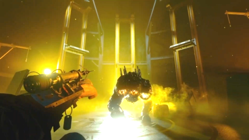 The first boss we are going to tackle is the yellow keycard boss. Once you try to pick up the grappling hook, the boss will charge you. You will be prompted to press LB/L1 to grapple hook away from the boss. You will find yourself in a nice spot to shoot from, but don’t get too comfortable because the platform will move up and down.