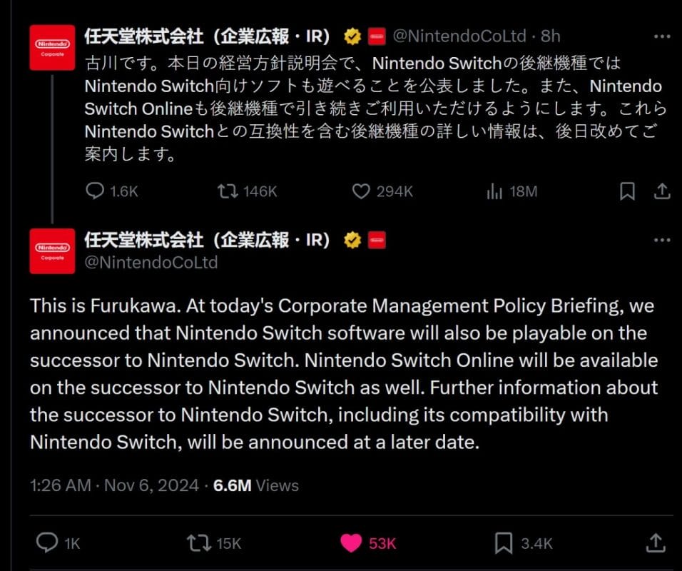 In a post made on Twitter/X, the president of Nintendo Shuntaro Furukawa confirmed that the Switch successor would be backwards compatible and have Nintendo Switch Online, with more details to be “announced at a later date."
