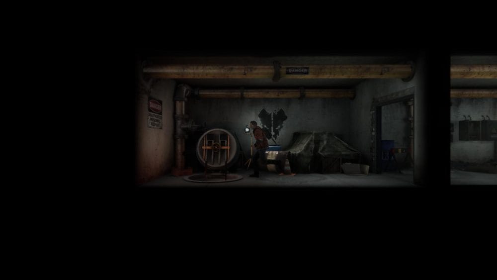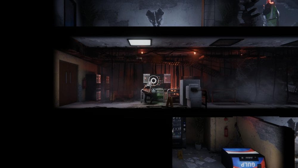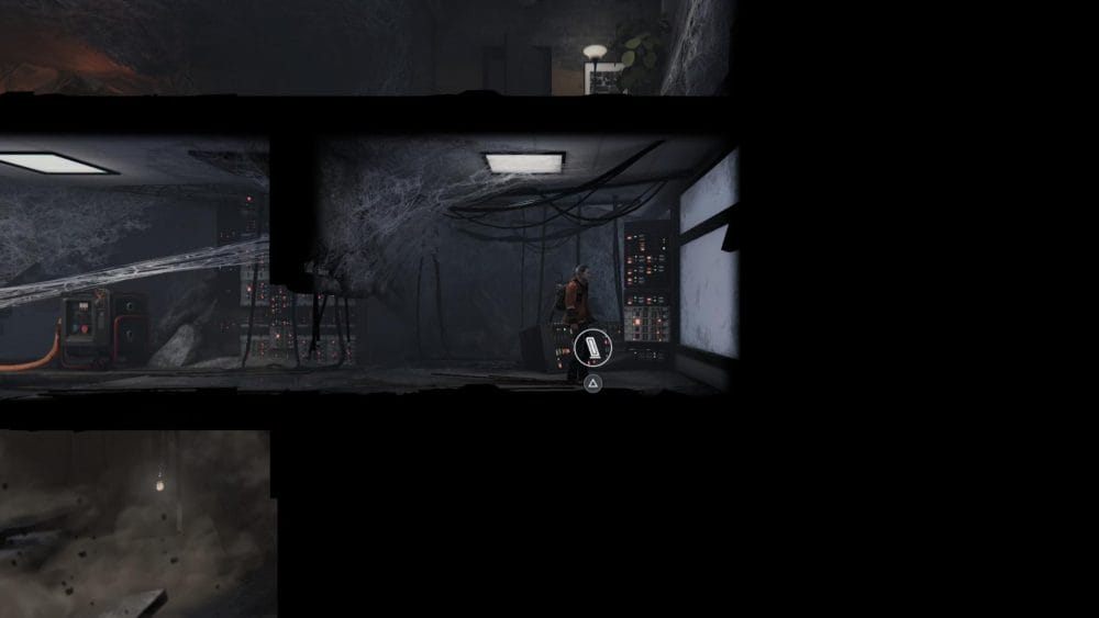 Head to the right, drop down and push the battery into the device to open the door to the right. Go through the door and turn on the generator inside.