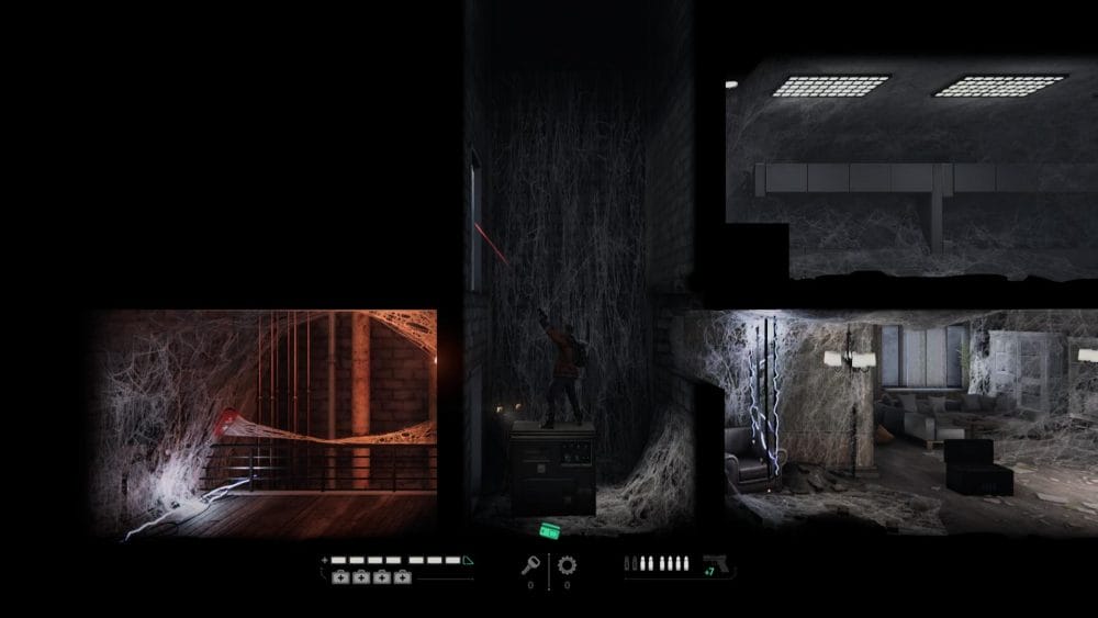 Water 7 – Continue through the demolished shopping mall and you’ll climb through a high window to find yourself back at the corridor full of electrified cables. Head to the left and smash the floor near the elevator. Use the metal crate to break the web, and shoot the fuse box through the hole in the wall behind the crate.
