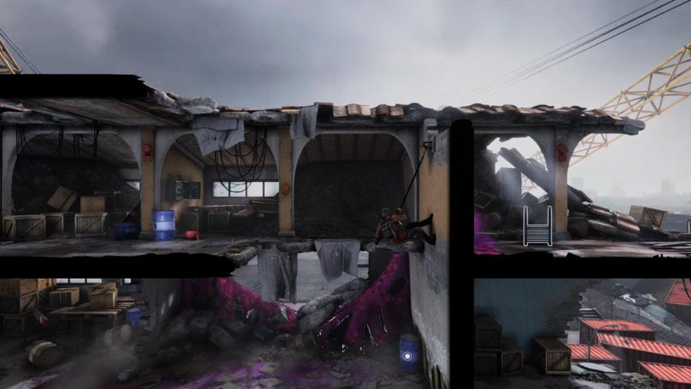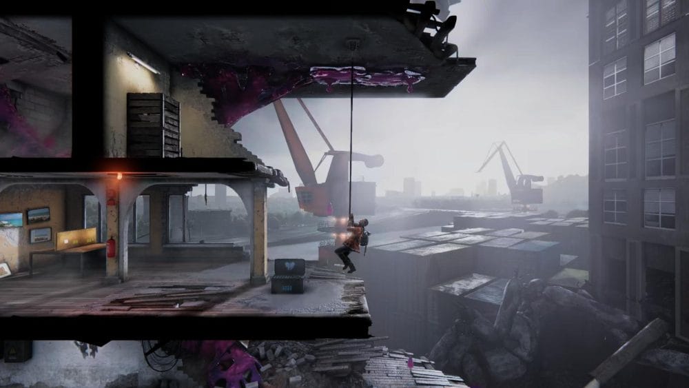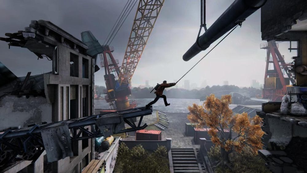 Clip 6 – This clip is impossible to miss! Part way through this level you will use your grappling hook to swing from a large pipe heled up by a crane.