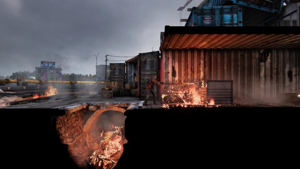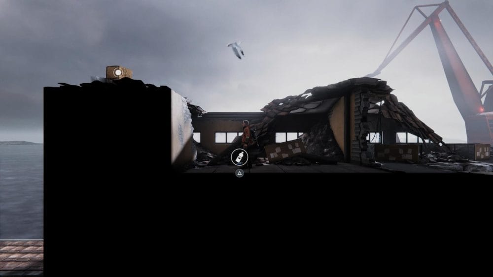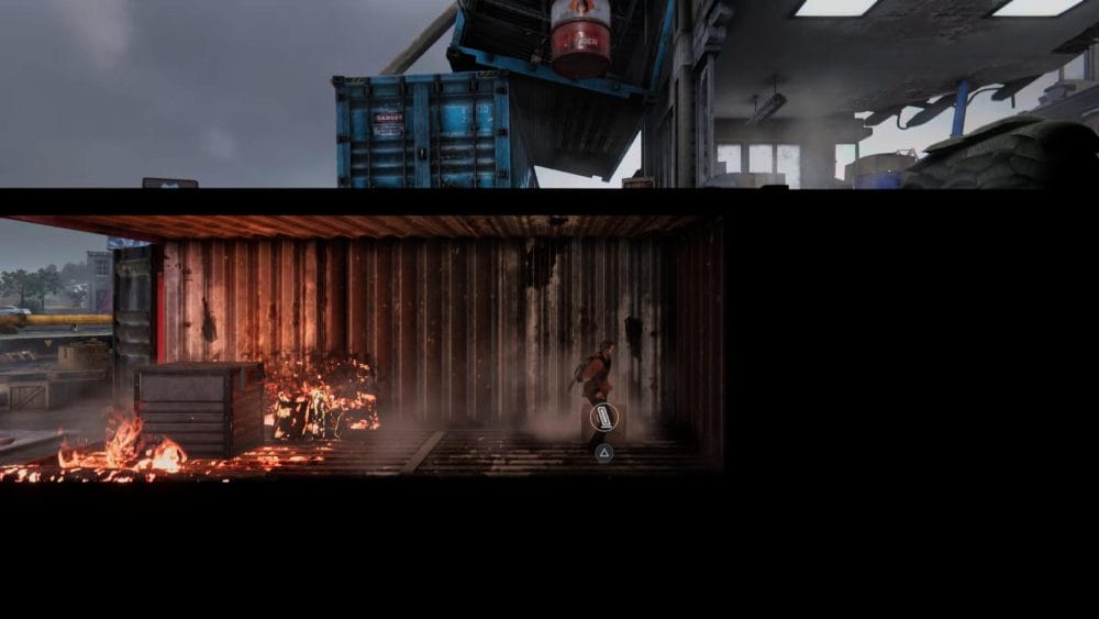 Clip 7 – Once you have crossed the river, head to the right until you reach shipping container. Use the grapple hook to pull the metal crate over the fire.