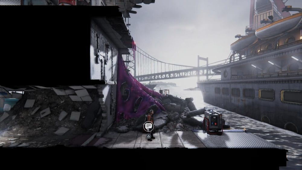 Push the barrel to the right, blow up the purple gunk, and grab the intel log before boarding the ship.