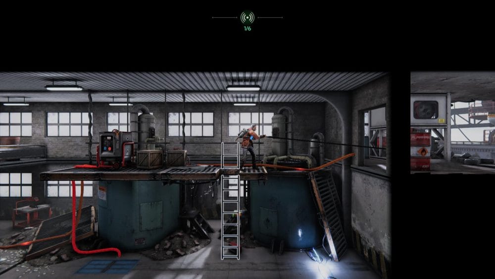 Clip 8 – Work your way through the facility until you reach a generator with a hatch above it. Turn the generator on and carefully climb down the left wall into the room below.