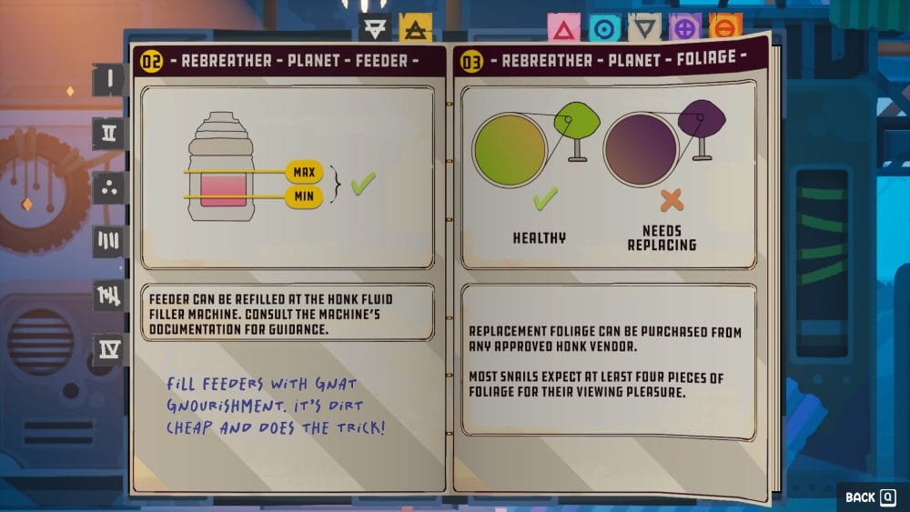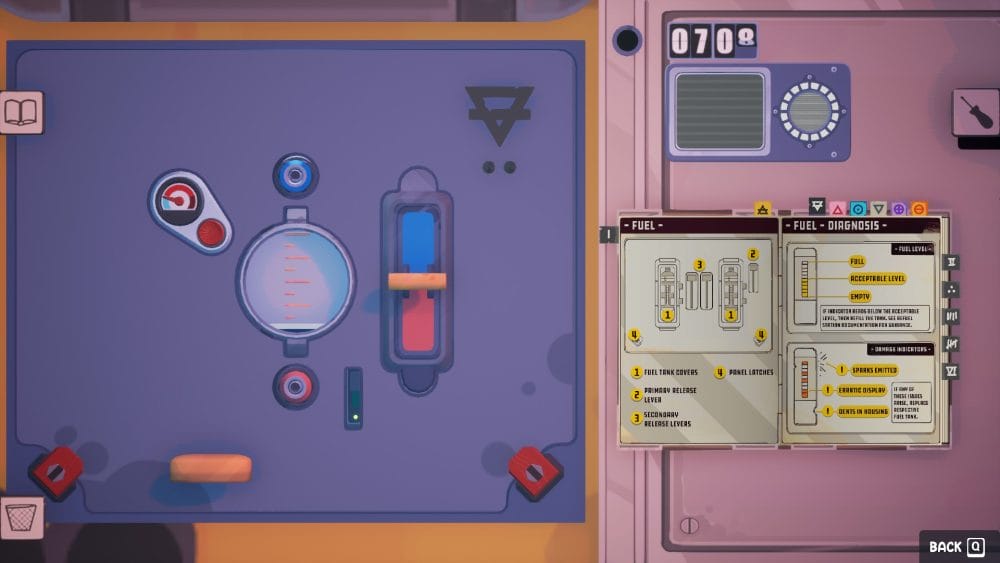 Now, I absolutely adore an in game manual, and the one on offer in Uncle Chop’s Rocket Shop certainly does not disappoint. There’s little hand scribbled notes on some of the pages giving you tips for how to repair things; detailed diagrams of each module and machine so you know exactly what you’re meant to be doing as your chafe under the pressure of getting your repairs done in time and fun pictures and logos from the various companies that pulled together the manual. Think Keep Talking and Nobody Explodes but with the colour and charm of the manual from Tunic.