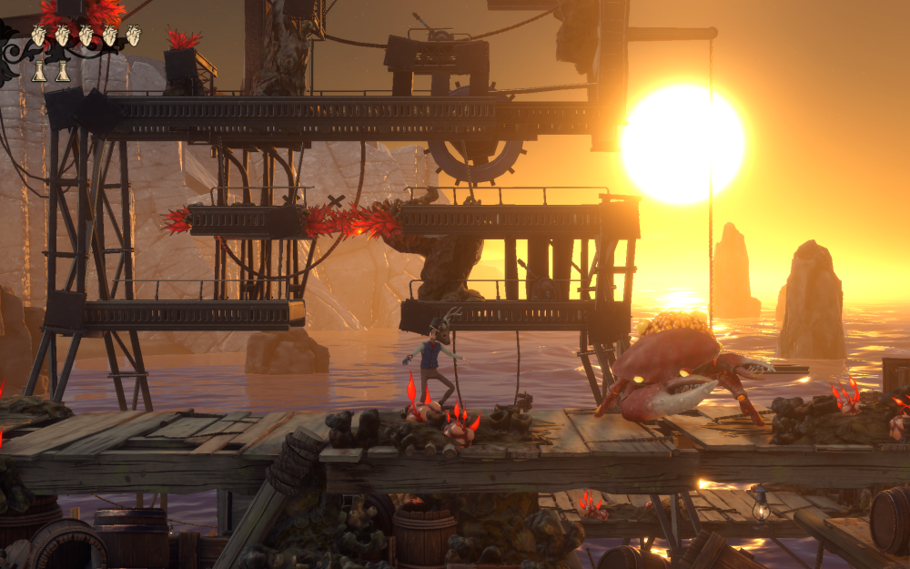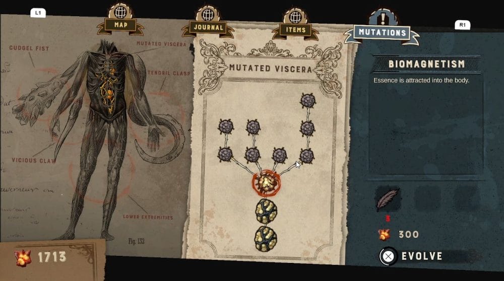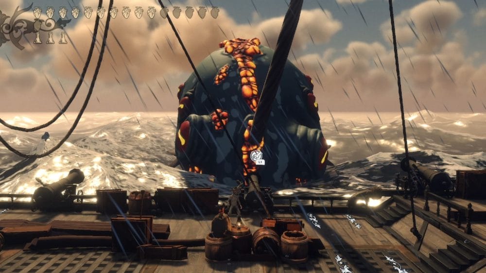 As you explore the world, slaying the mutated monsters inhabiting it, you collect Vile essence and various materials, like claws, bones, organs, etc. These are then used to upgrade the player’s abilities, adding extra hits to combos, increasing reward drops from enemies, and even some great UX enhancements like a compass that points to collectibles. You unlock your new movement and attack options from the game’s various bosses. These are another highlight of Venture to the Vile, as each one is distinct in both creature and encounter design, with several making use of the game’s plane-shifting mechanic. My personal favourite was the giant horned kraken that attacks, punching it’s tentacles up through the deck of your ship as you navigate between several cannons. Whether a test of skill, or more of a puzzle needing to be solved, I was excited to see what each encounter had in store.