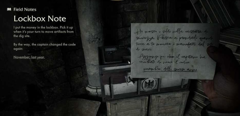 The Excavation Site safe is found inside the guard house that sits atop the excavation site. The safe is also part of the "Signs Of Trouble" fieldwork mission which is started by finding a note for Gina in the Sistine Chapel's Altar.