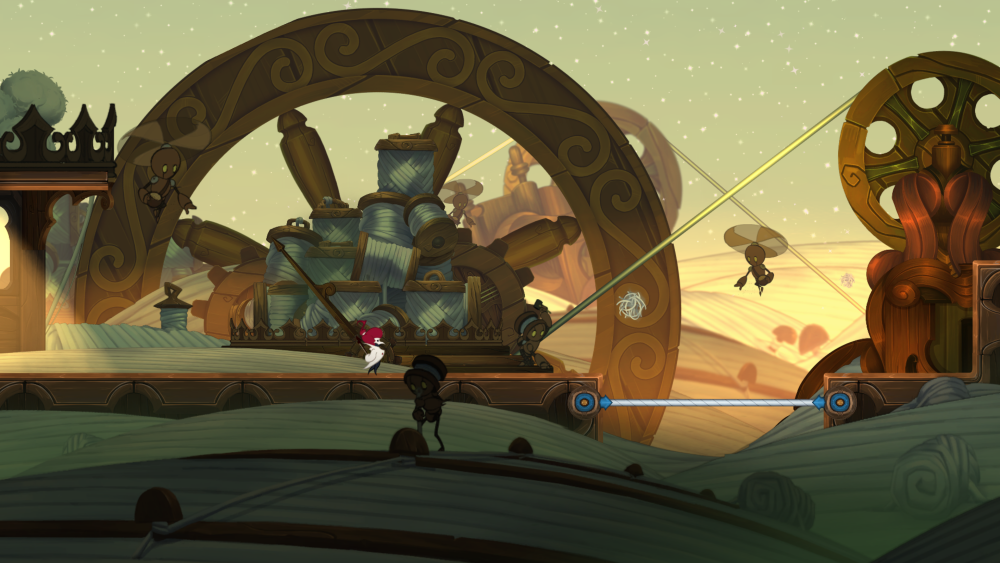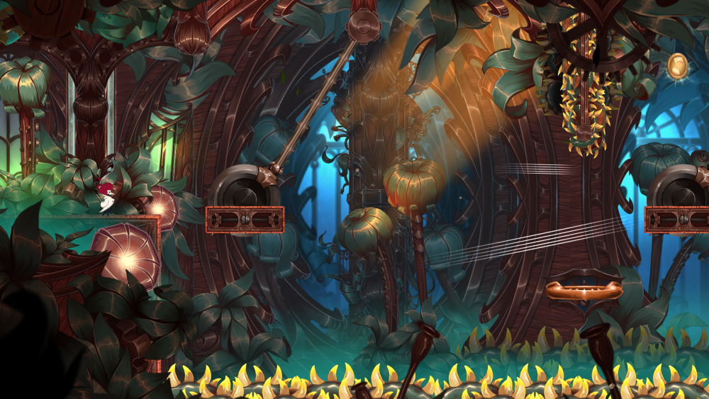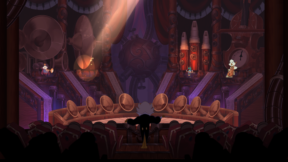 Between , The Founder’s Amphitheatre, Woodwind Glasshouse, String Meadows, and the Brass Castle, you’ll travel through various themed worlds that are all distinct in their locales and tailored to the Founder that resides there. The Matriarch, for example, changes the day to night, as well as the seasons by playing her cello, and the the world changes throughout your traversal of that level. It’s a shame that this doesn’t change the gameplay on the level (such as icy traps when winter appears), but that’s a minor quibble).