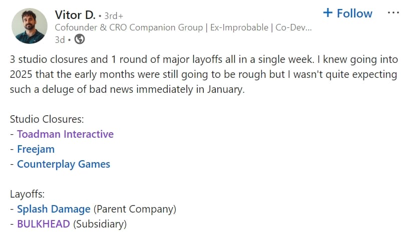 While this may be the start of a new year, it means nothing to the tumultuous nature of the video games industry. 2025 seems set to be a repeat 2024, which we covered before. In the last week, three different studios all announced they are closing their doors. The studios in question are Counterplay Games, Toadman Interactive, and Freejam. Along side these closures, lay offs were announced at Splash Damage and its subsidiary company BULKHEAD.