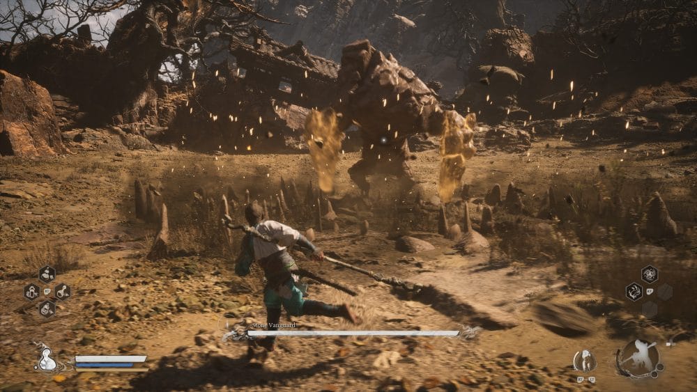 Before going in to this fight, it is vital you have pillar stance unlocked. With it active, you will be able to sit on top of your staff when holding your heavy attack button down. I also used 2 Tiger Subduing Pellets to up my attack, equipped Wind Bear Staff, and wore the ebongold outfit.