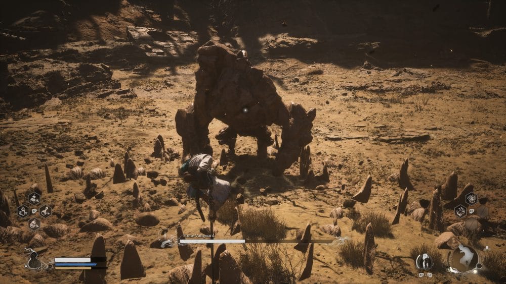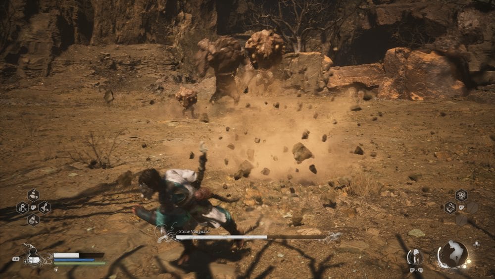 About half way through his health bar, you will see him summon boulders that he throws at you. Dodge these or sprint sideways. Be prepared for him to jump in the air and attack you from above once the boulders stop coming.