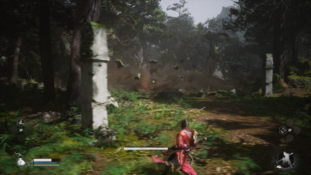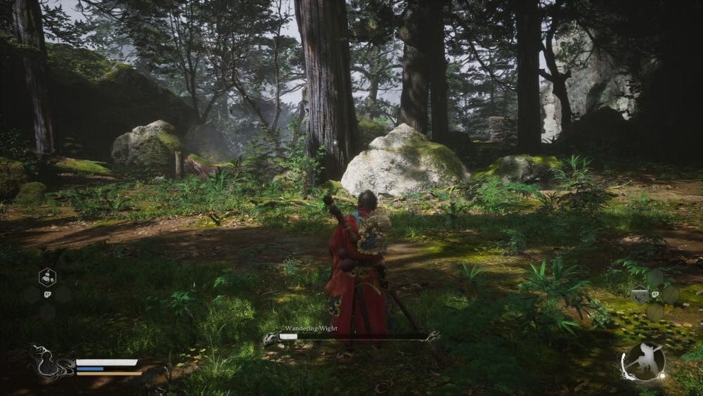 If you are having a hard time avoiding his aggressive attacks while trying to recharge, there is a nifty spot behind this rock and tree that you can use to trap him and get him stuck. This isn’t a glitch, it just takes him a moment to realize he needs to walk around to approach you. Keep a reasonable distance from him and he will continue to just attack from this spot. If you run away too far, he will quickly walk around the rocks.