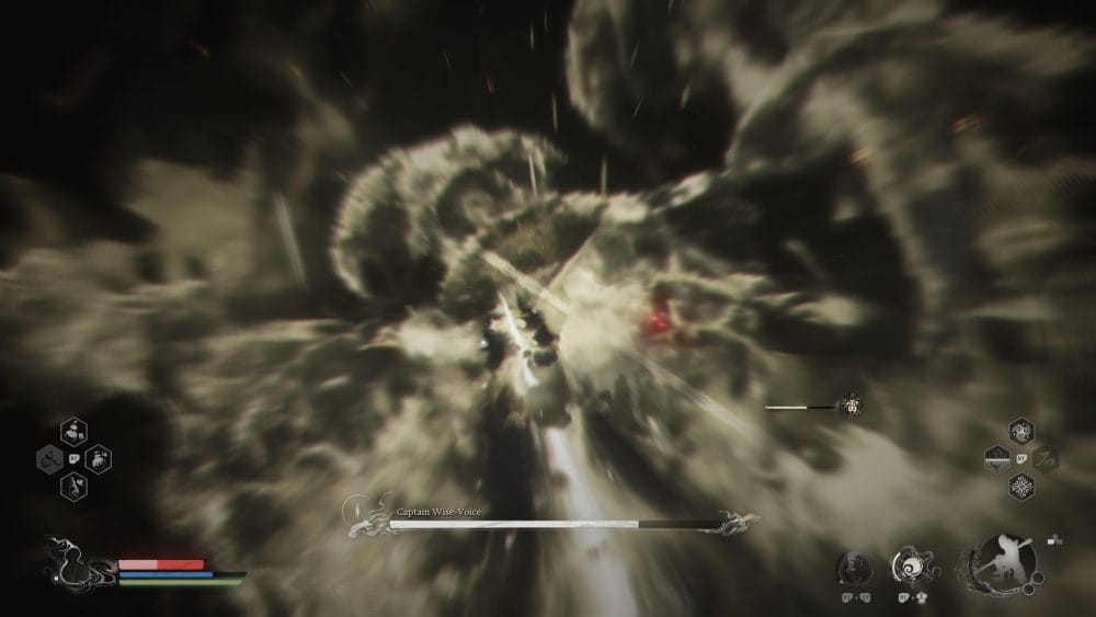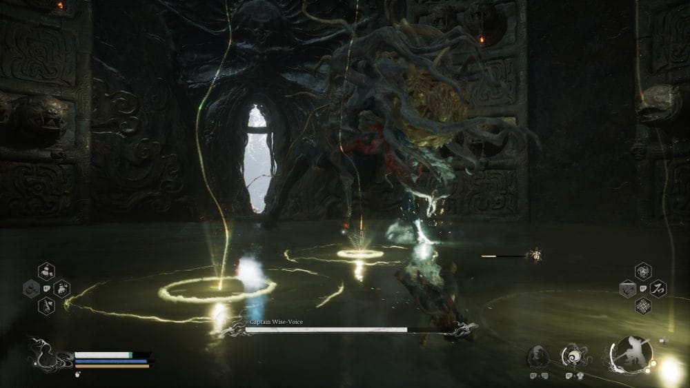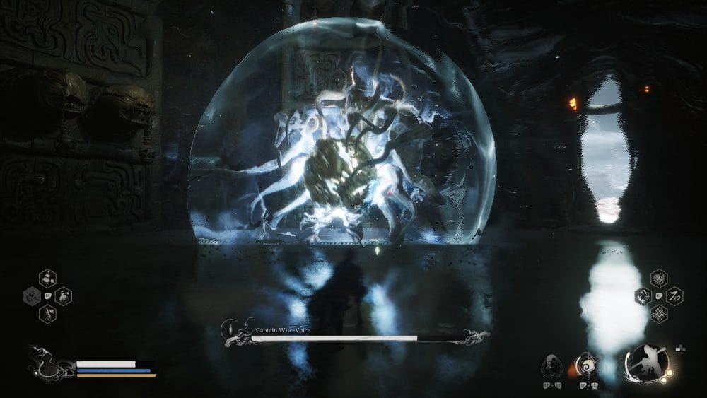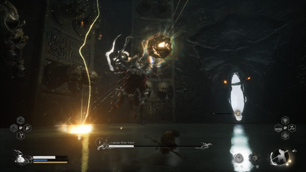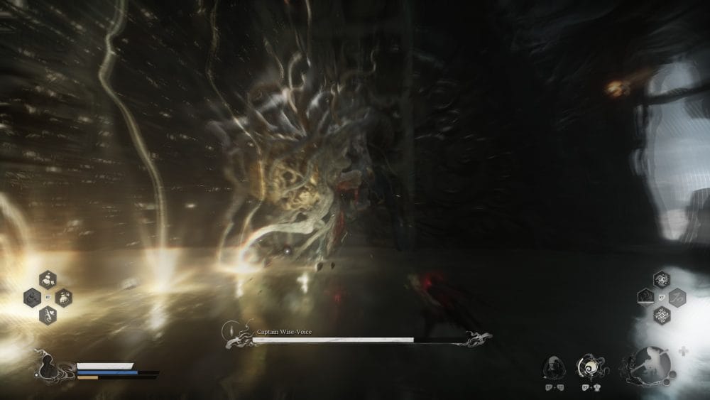 As soon as we enter the arena, before the boss even shows it’s health bar, let’s go ahead and summon our decoys and use a Evil Repelling Medicament. Charge him while avoiding his lasers. Hopefully your decoys are aggro’d.