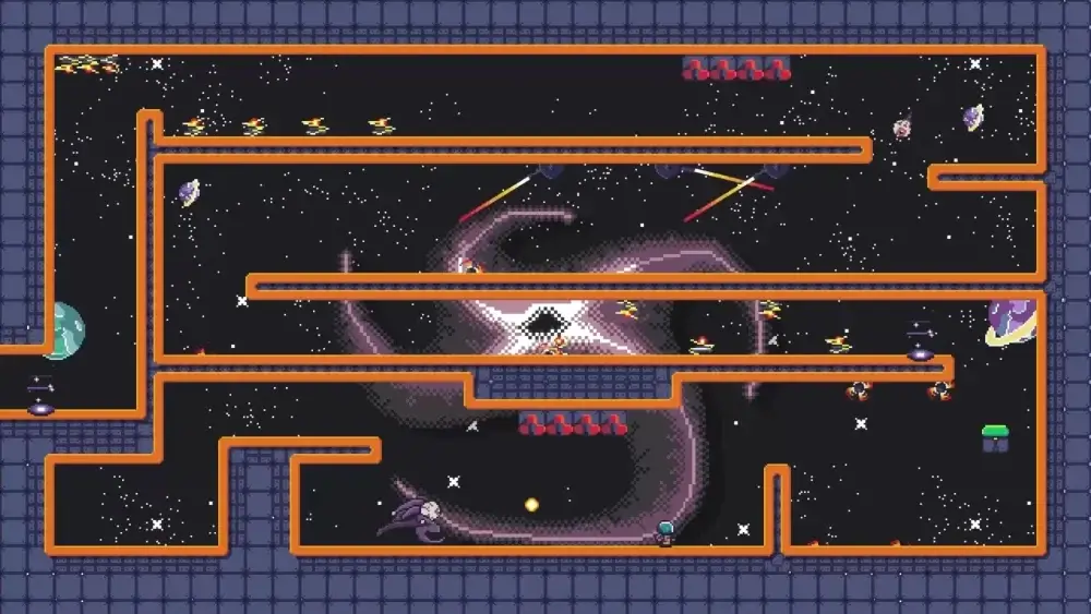 Take off on a crazy adventure with Stellar Strider, a precision platformer packed with challenges, obstacles, flying saws, lightsabers, aliens, and gravity inversion.