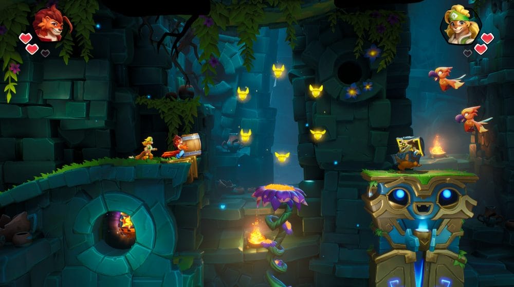 Niko and Luna are not alone on their journey. In some levels there are large crates that can be smashed to unlock one of several different mounts. These include a bat that fires a sonar blast, a warthog that charges through enemies, a large frog that spits bouncing water drops, and a seahorse that shoots a laser. Fans of the Donkey Kong Country games, developed by Rare for Nintendo, will recognise this mechanic.