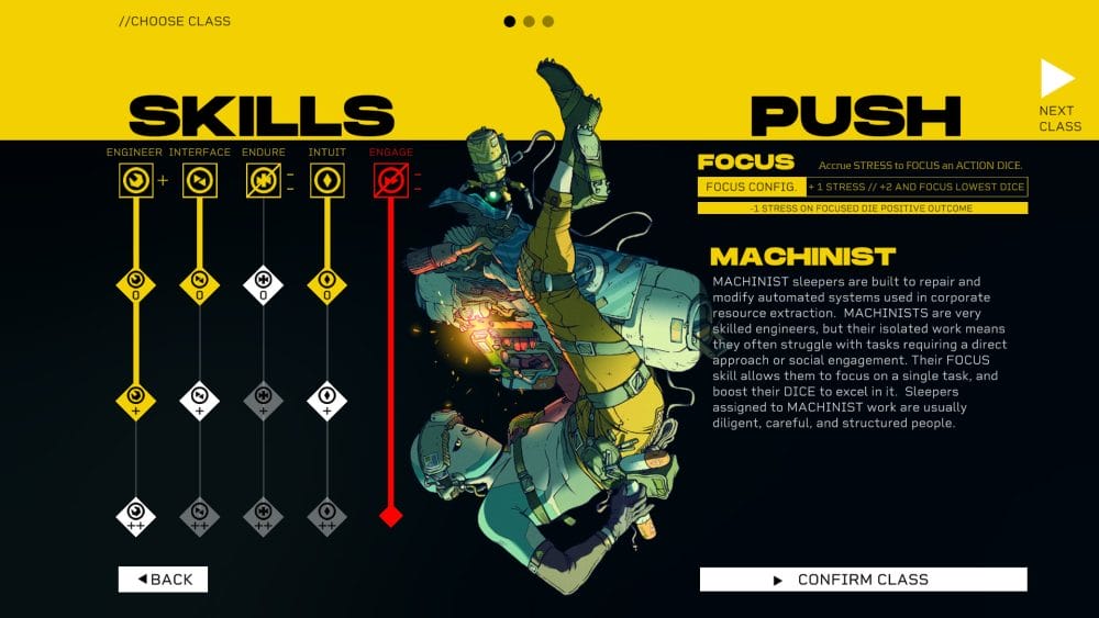 You choose from 3 distinct classes; Operator, Machinist and Extractor. They each have their own skills, and more importantly they each have a skill line that cannot be upgraded. This is going to make a big difference to your playthrough – so choose carefully. I chose the Machinist – who gets an initial boost to Engineering, but can never upgrade Engage, meaning they’re very good with machines but pretty useless with people (just like real life). A new feature added to Starward Vector is the push abilities, which are again unique for each class. These abilities can only be used in the contracts of the game and each of them increases Stress.