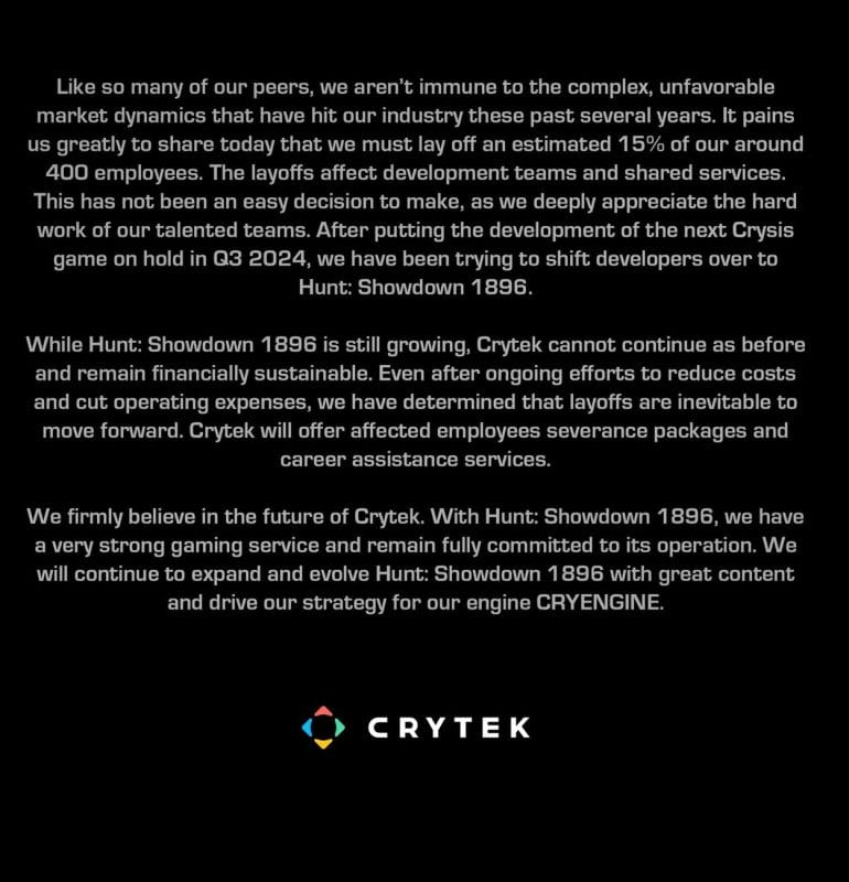 More layoffs have come today, this time from a beloved studio affecting one of the most anticipated shooters. Crytek, the makers of the CryEngine, Hunt: Showdown 1896 and the Crysis trilogy have announced they are laying off roughly 15% of their 400 employees.