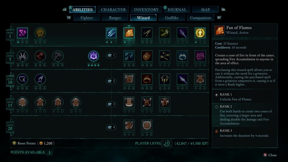 The "Ability" and "Character" section is where the customization in Avowed really shines bright. Under the "Abilities" section is where you unlock different abilities and specials for your character. You have Fighter, Ranger, Wizard, Godlike and Companion listed. Each options have different skills that you unlock and will be able to use throughout your playthrough. I invested most of my points into Wizard since I was wielding a grimoire. You can also choose to focus your points into a certain element as well. So, if you wanted to be a fire bender you could.