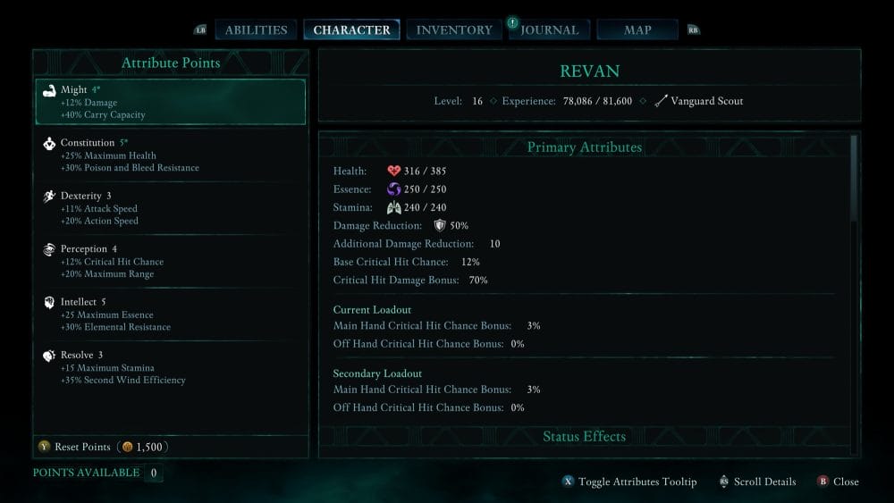 The "Character" section is where you added points into your Might, Constitution, Dexterity, Perception, Intellect and Resolve. Each one would increase two different stats, for example putting points into Dexterity would increase your attack and action speed. This page also shows you a break down of your health, essence, stamina, critical hit damage and more. You can get incredibly detailed to ensure you are getting everything out of your build. They did include the feature where you are able to respec in case you would like to try another build.