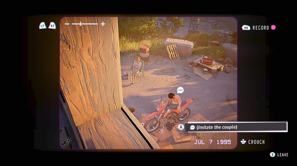 Move across to the opposite side of the roof now and look over the side to the ground. You will see a biker and woman down below. Record both of them separately for 2 different memoirs.