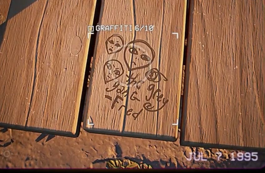 To the left of the previous graffiti you will see what looks like a work bench with a stop sign in it. On the bottom of this you will find the next graffiti.