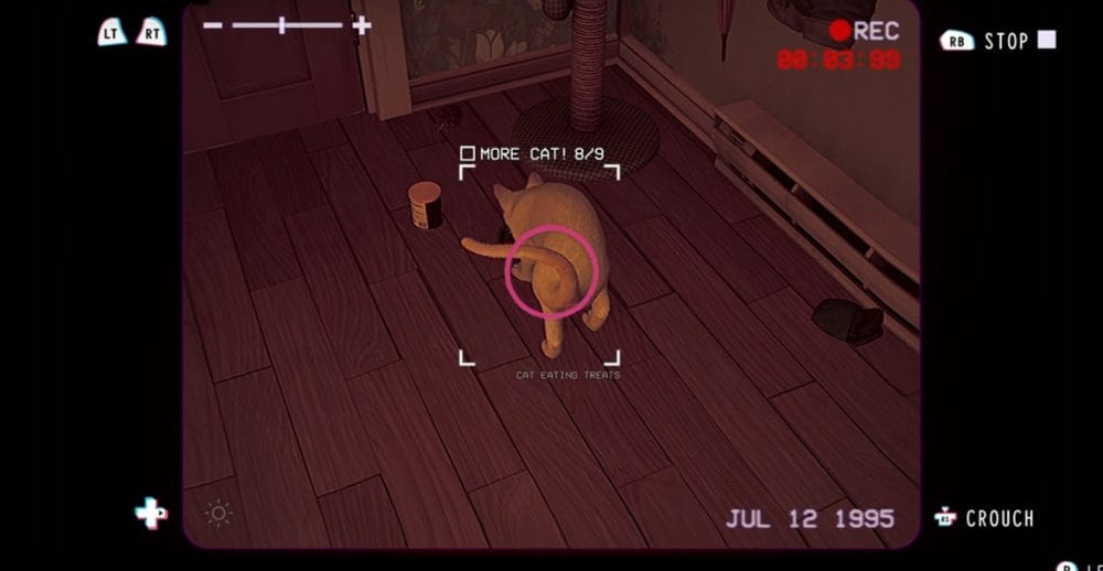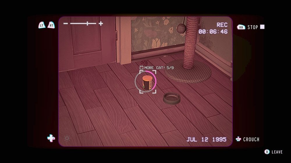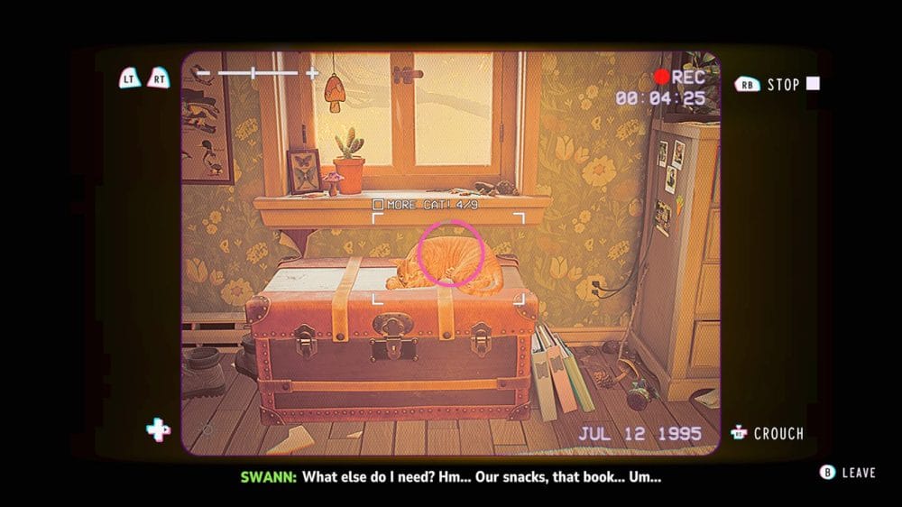 Once you enter your room and take control of Swann you will see your cat laying down on the trunk under the window. Take your camcorder out and record it.