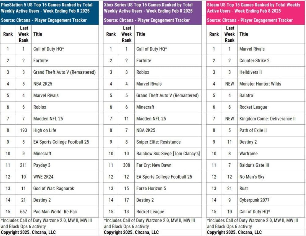 So, what titles are people playing? The latest data Piscatella refers to was not obtainable at the time of writing this article. However we were able to secure the data from the week ending 8 Feb 2025. You won’t be surprised to see the top-10 across consoles below. The list includes the stalwarts of Call of Duty HQ (including Black Ops 6 and Modern Warfare 2 & 3); Fortnite; Grand Theft Auto V/Online and Marvel Rivals. Also sitting in the top-20 charts on both consoles are titles available in PlayStation Plus and Xbox Game Pass subscriptions.