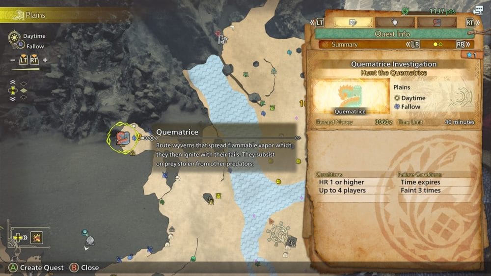 When you aren’t in a mission you can essentially free roam the maps, and of course the world is filled with many monsters. Using your map you can spot many different species, including the ones you want to hunt for field surveys. Find the one you want to do and head that way. One thing of note, you have to have the guilds permission to hunt it but there’s an easy way to check that.