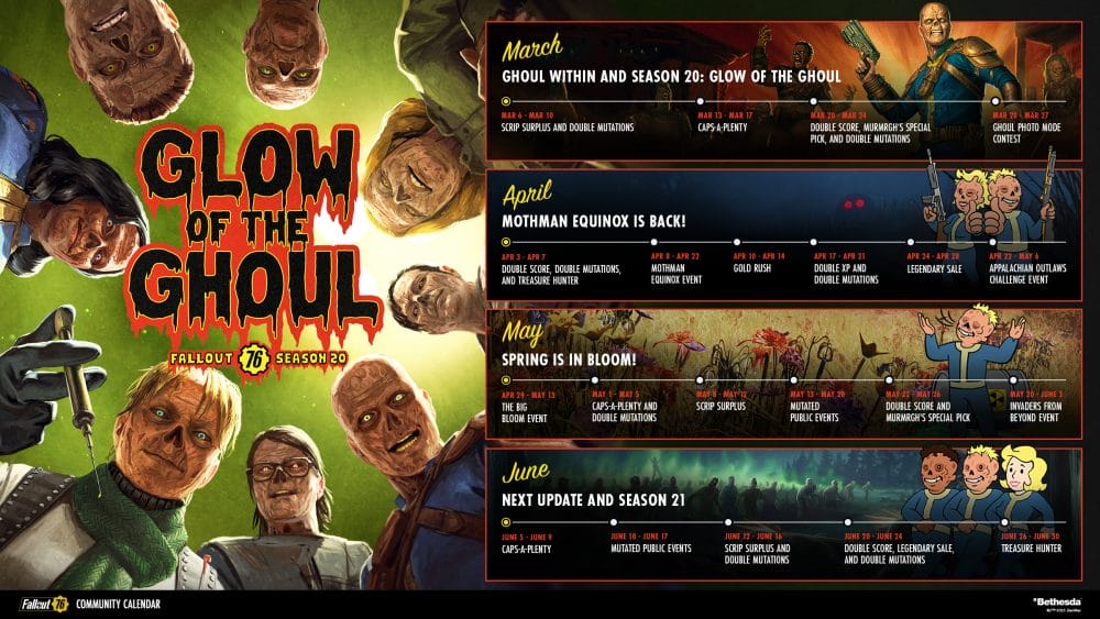 Alongside a trailer breaking everything down, the post includes a calendar, detailing upcoming events happening in the freshly irradiated Wasteland from March through to Ghoul, I mean June!